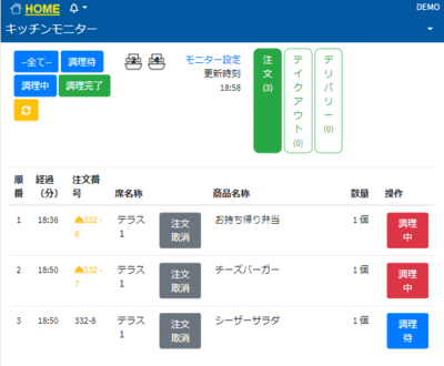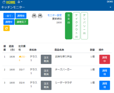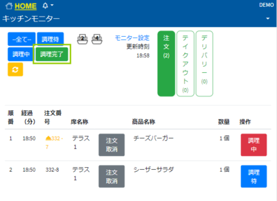 間違えて調理完了にしてしまった場合は左上の調理完了を押します。