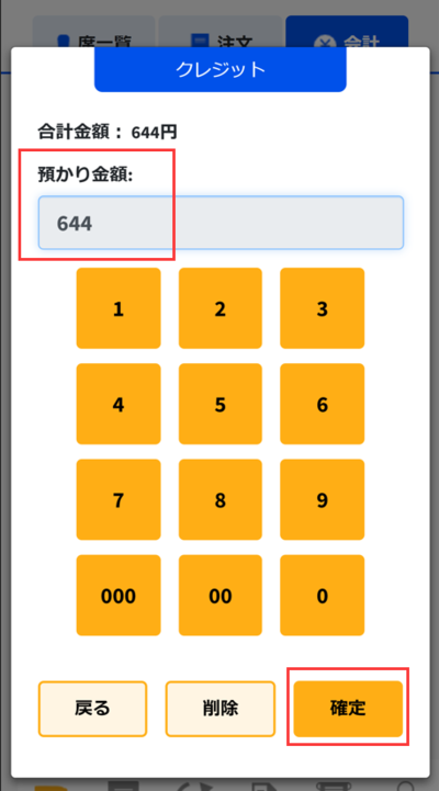 ②お預かり金額に金額を入力したことを確認して画面右下の「確定」をタッチしてください。