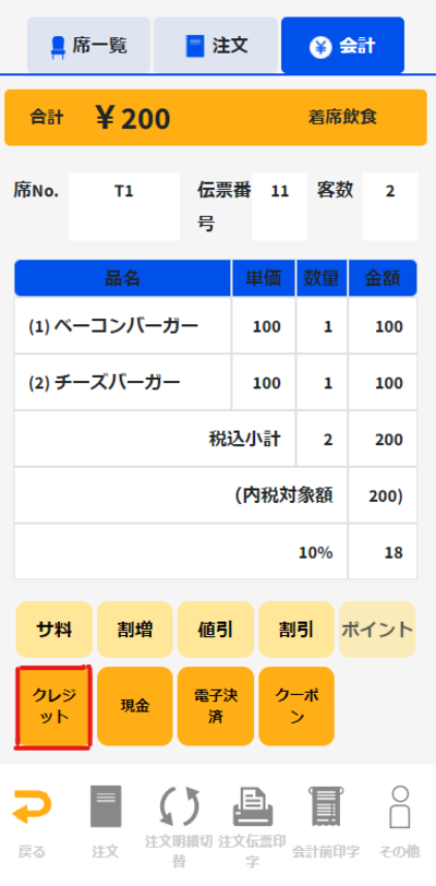 ①「席処理」画面から「会計」タブを選択し会計を行いたいテーブルを選択してください。 会計画面へ移行します。