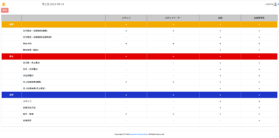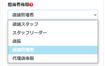 スタッフ、スタッフリーダー、店長、店舗管理者と4つの権限に分かれています。 それぞれ操作可能な項目が異なるので「スタッフ権限についてはこちら」を参照してください。