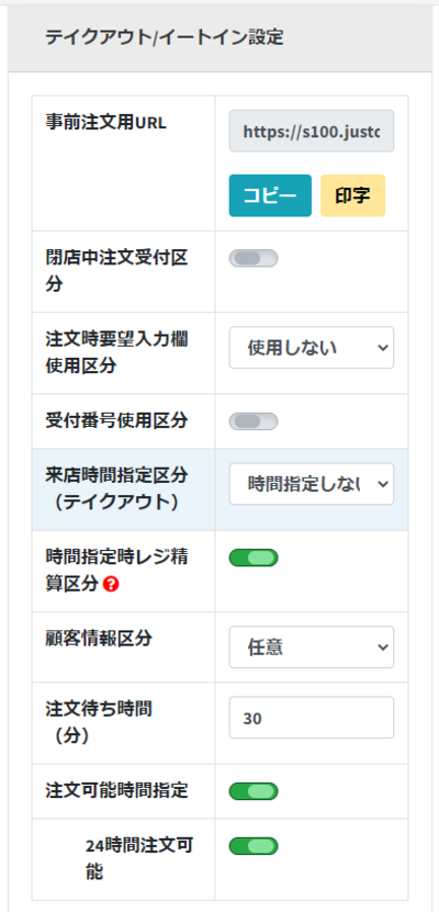 | 来店時間指定区分(テイクアウト | 来店時間指定区分(テイクアウト)を設定することができます。 |