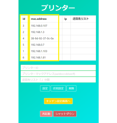 ⑤リストの該当プリンターのアドレスが変更された(=新しいプリンターが登録された)ことを確認し、「キッチン設定画面へ」をタップしてください。