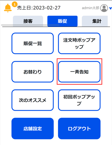 ①販促タブから「一斉告知」を選択します。