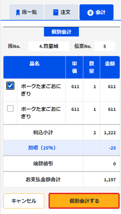 ②表示される画面上の「続けて個別会計に進む」を選択します。