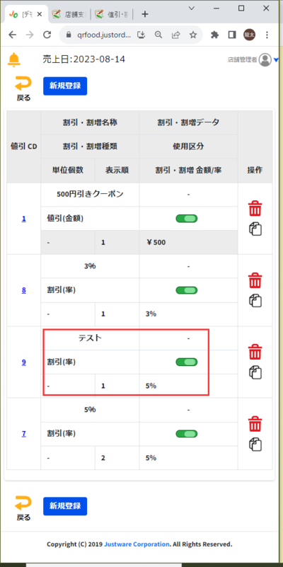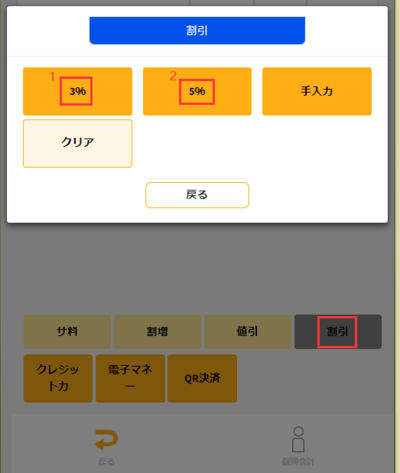 同じ種類の増額・減額の設定をした場合(例えば「割引」の3%と5%)、会計画面での並び順を設定できます。