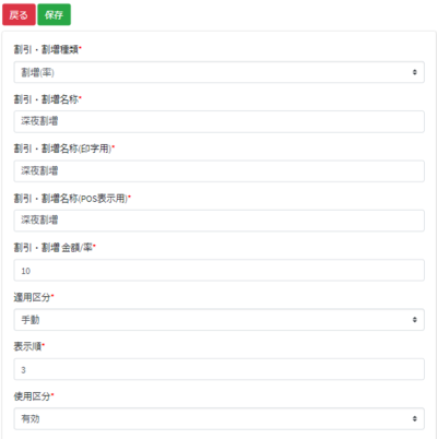 名称と印字用名称がお客様に表示されます。また割引・割増が複数ある場合レシートの下部にまとめて表示される為どんな割引・割増なのか分かる名称に設定して頂くことを推奨します。