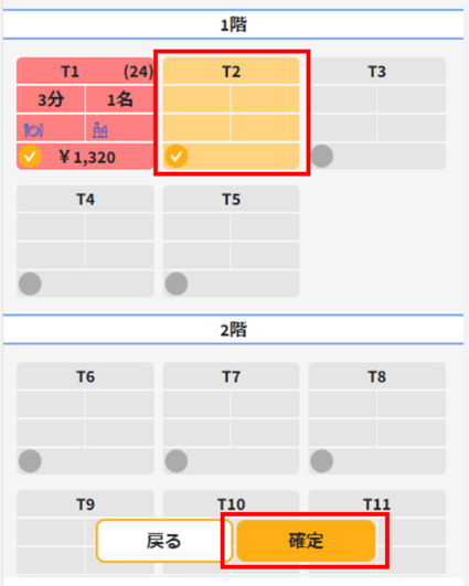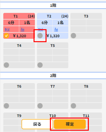③着席されているテーブル(赤色)のうちした減らしたいテーブルを選択し、青色になったのを確認して確定を選択します。