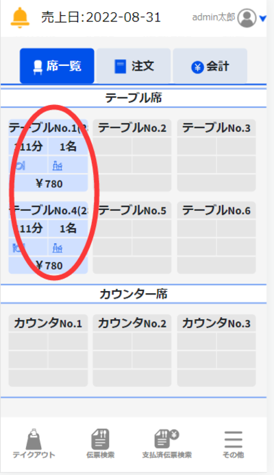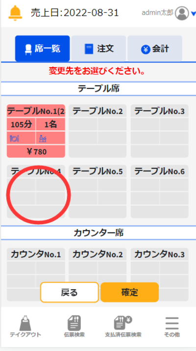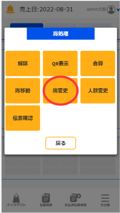 「席処理」画面において「席一覧」タブを選択した状態で、「着席状態」のテーブルのうち「席変更」をしたいテーブルを押してください。