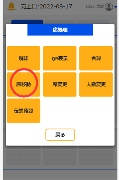 「席移動」の項目では、着席状態のテーブルうち席を移動させたいテーブルに移動させることができます。
