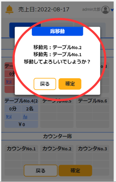 次に、移動先のテーブルを選択し「確定」ボタンを押します。すると、「移動元テーブル名」「移動先テーブル名」と「移動して宜しいですか?」という確認のメッセージが表示されますので「確定」を押すと席移動が完了します。