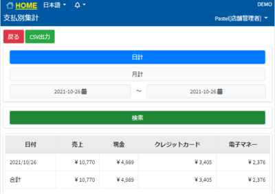 締め処理はWEBPOS使用時のみ表示されます。 支払別の売上を確認することが出来ます。 日次か月次か選択し検索します。 CSV出力を行うことも可能です。