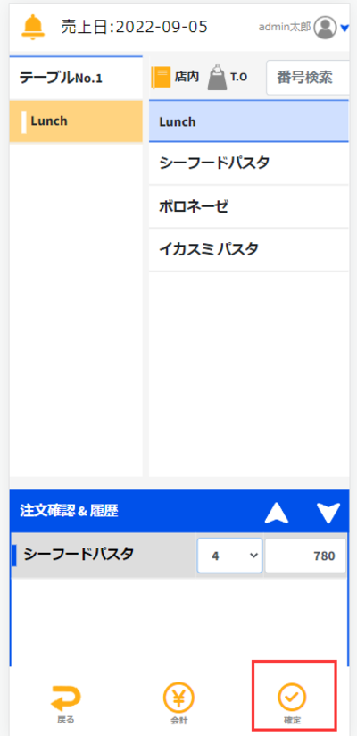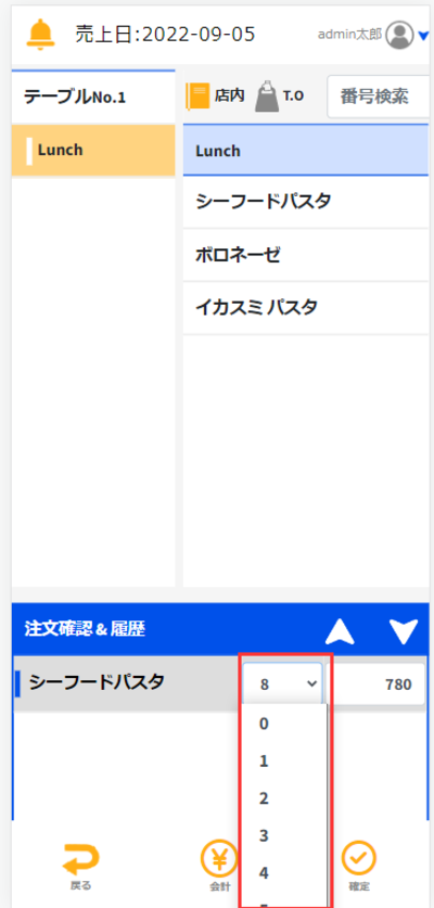 ある商品が注文されている状態で新たに注文商品の個数を減らしたいとき場合にはの場合と同様に「注文」タブが選択されている状態であることを確認して変更したいテーブルを押します。