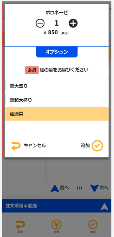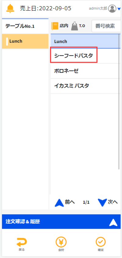 ここで「シーフードパスタ」をタッチすると個数が追加されます。