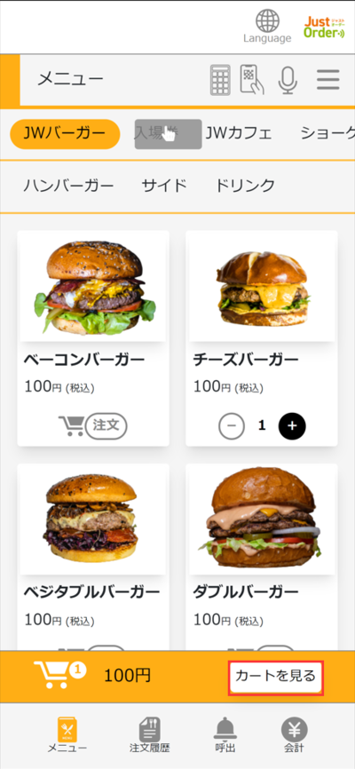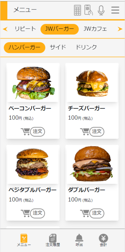 ②QRコードを読み込むとメニュー画面が出てくるのでここからお客様自身で注文することができます。