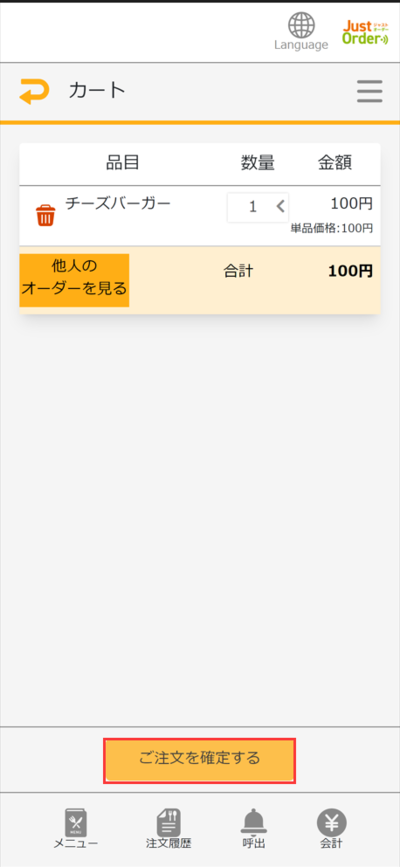 ⑤「ご注文を確定」をタッチすると注文が完了します。