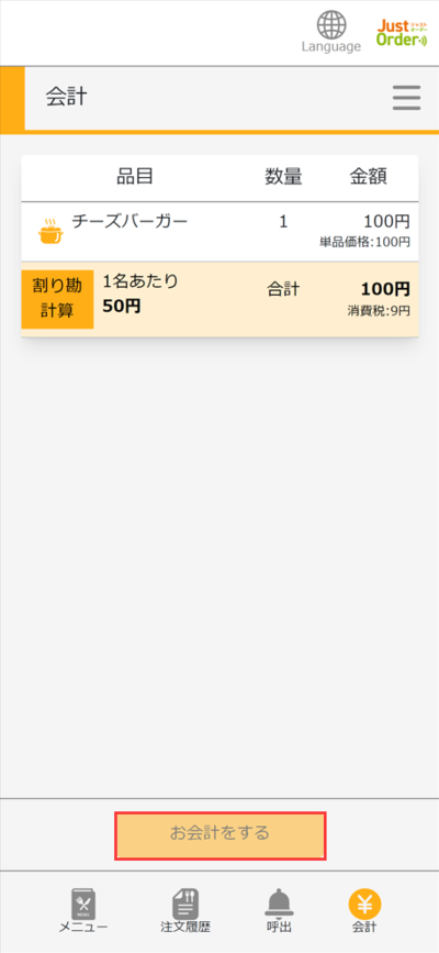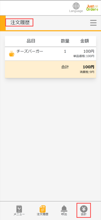 ⑦注文履歴からお客様自身でお会計をすることができます。食事が終わったら「会計」をタッチして会計に進んでください。