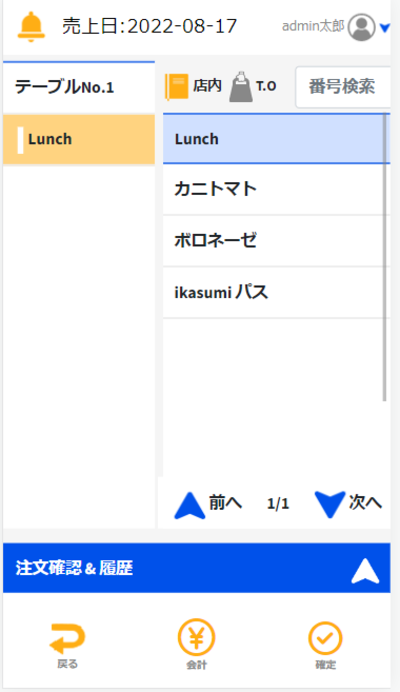 画面に表示されている注文を行いたいテーブルをクリックすると注文画面へと移ることができます。
