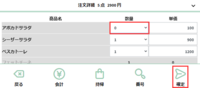 スタッフ端末を押します。 注文を押します。 注文取消しをしたい席を選択しますとそのままメニュー画面に遷移します。 注文詳細を開きます。 数量の部分を押します。 0から20までのプルダウンが表示されます。 注文取消ししたい商品を0にします。 0にした状態で確定を押します。 削除完了です。
