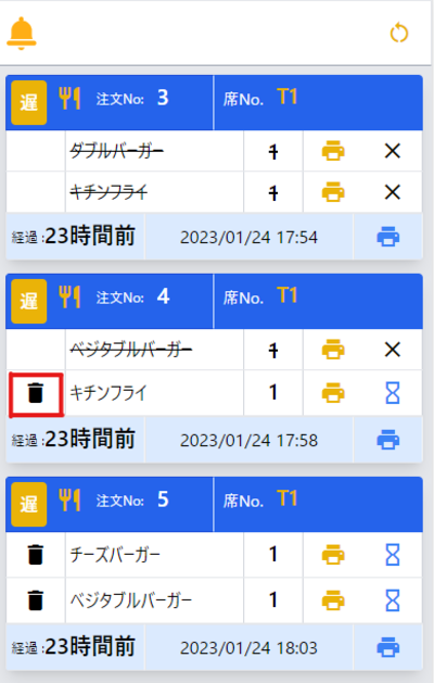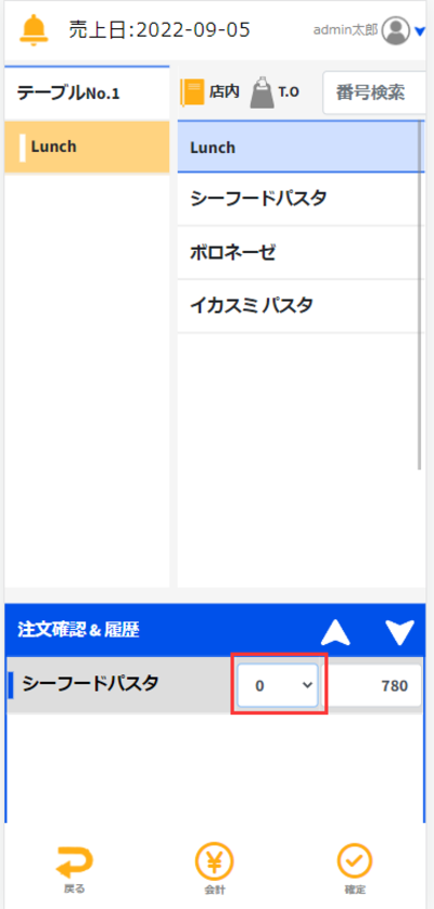 ③「シーフードパスタ」をキャンセルしたい場合は「注文確認&履歴」中の個数の部分を変更してください。