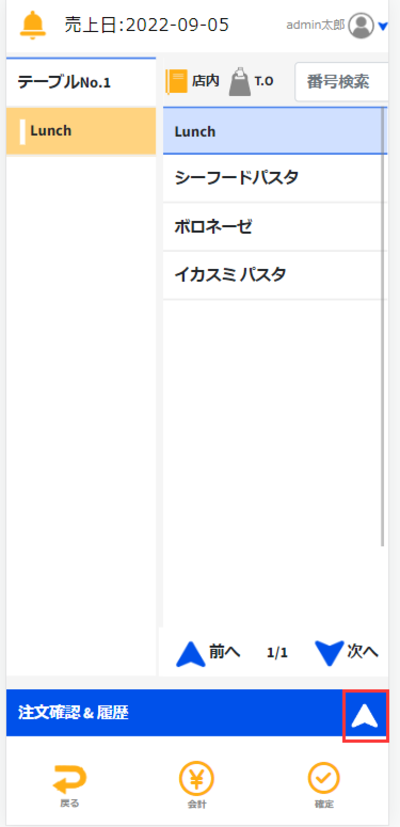 ①「席処理」画面で「注文」タグを選択している状態でキャンセルをしたい注文があるテーブルを選択してください。下部に「注文核確認&履歴」が表示されます。
