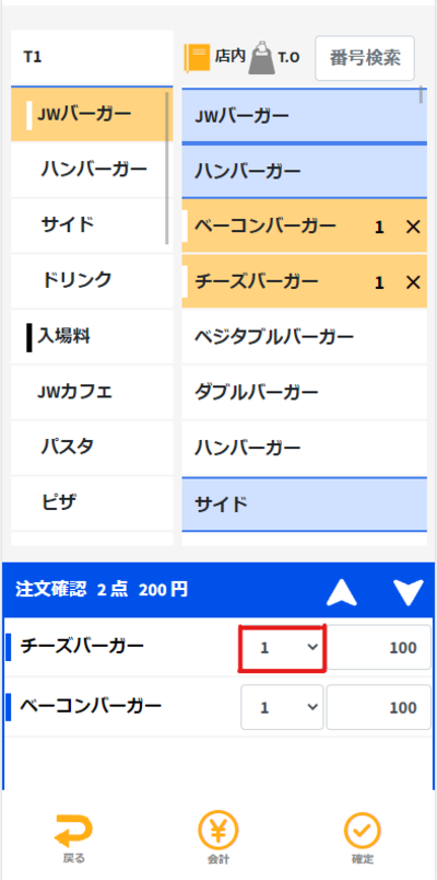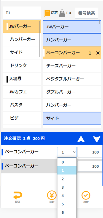 ②「新規注文」の場合と同様に商品名をタッチで追加注文が可能です。