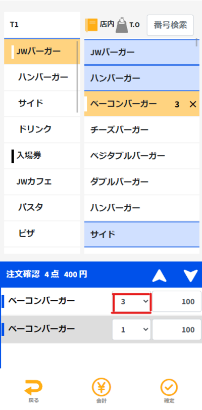 ③すでにある注文の個数を増やしたい場合は、メニュー画面で右下の矢印マークをタッチしてください。