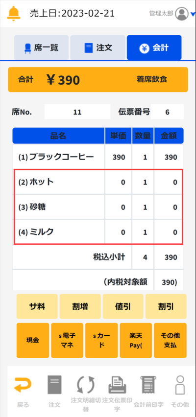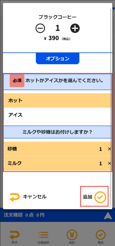 ②お客様に注文を聞く際に伺って選択してください。選択したら「追加」をタッチしてください。