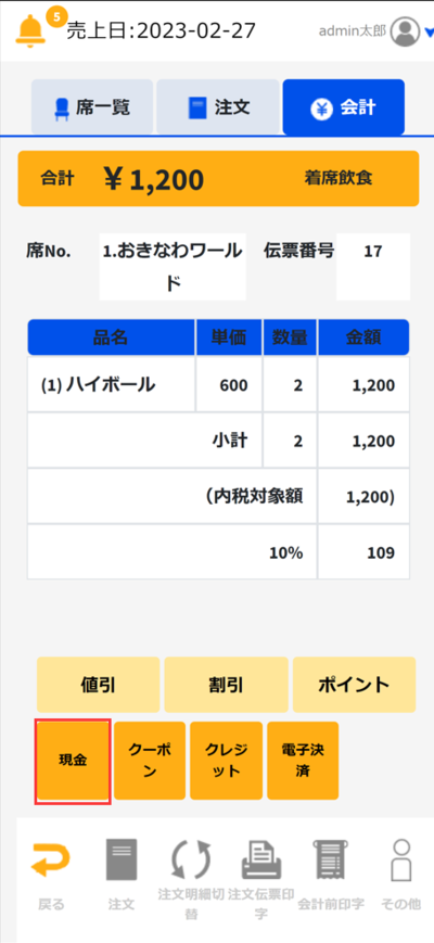 ①会計画面で「現金」をタッチします。