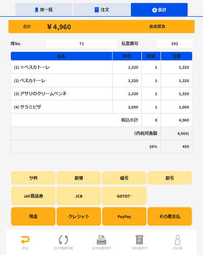 まず、「席処理」画面から「会計」タブを選択し会計を行いたいテーブルを選択してください。会計画面へ移行します。