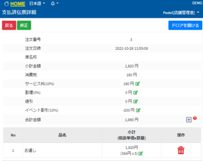 お通し商品の小計のを押します。