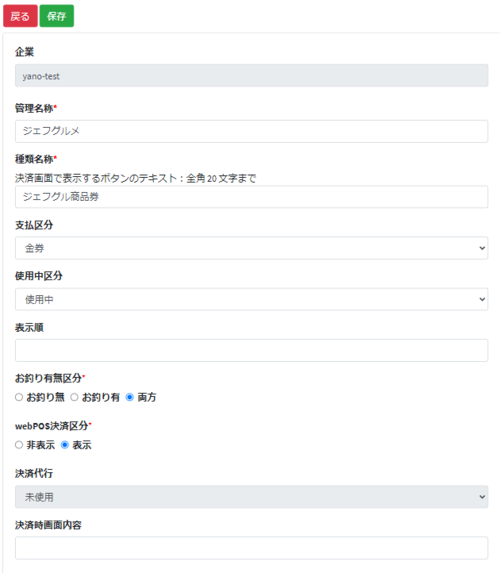 ❶管理名称:店舗側がWEBPOSとマスタ上で管理する名称です。 ❷種類名称:お客様のレシートに印字される名称です。 ❸支払区分:金券を選択します。 ❹使用中区分:使用、不使用を選択します。 ❺表示順:WEBPOS上での表示順になります。 ❻お釣り有無区分:金券の種類によってお釣りが出る金券、出ない金券があるので事前に設定することが出来ます。 両方にした場合お釣り有か無かWEBPOS画面上で選択出来ます。 ❼WEBPOS決済区分:表示を選択します。 ※金券を選択した時点でセルフ決済区分の選択項目は消えます。 ※決済代行、決済時画面内容は設定しなくて問題ありません。