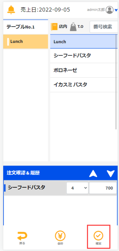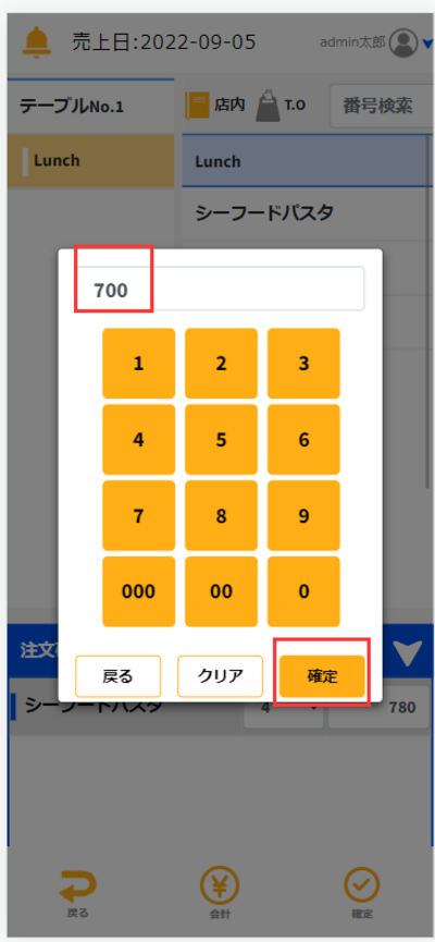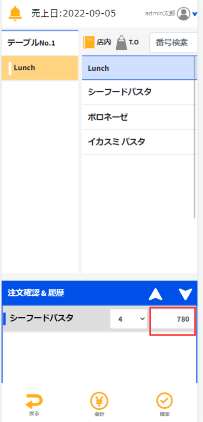 商品の金額を変更したい場合には「注文」タブが選択されている状態であることを確認して変更したいテーブルを押します。