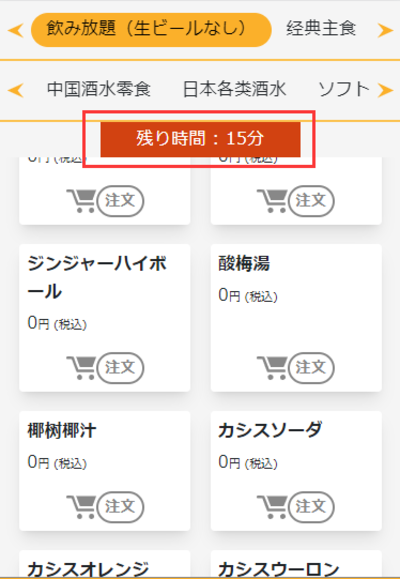 飲み放題メニュー内は商品全部0円なので、自由に注文を行えます。