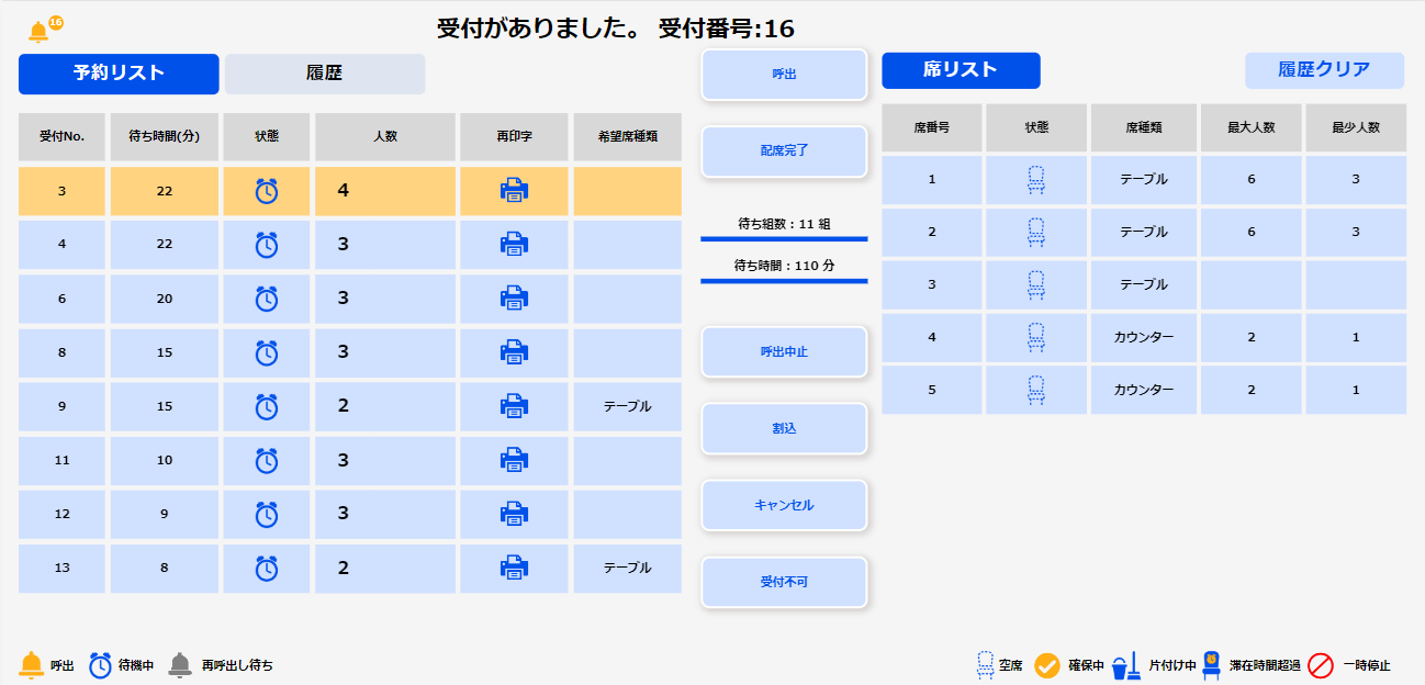 | 状態 | 呼出済・案内済・キャンセルで表示 |