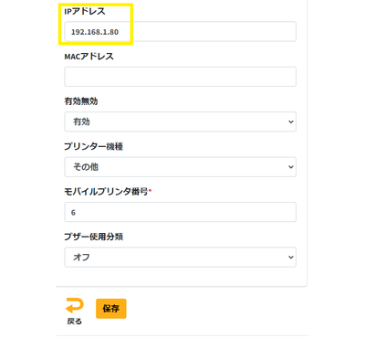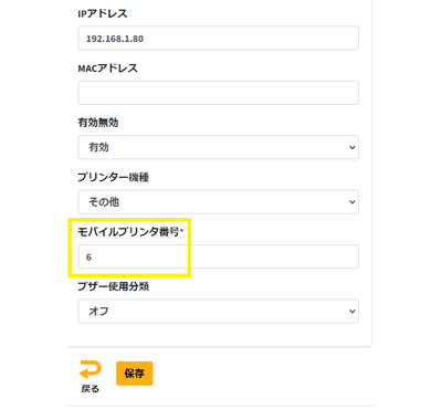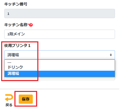 ⑦「キッチンプリンター設定」に戻り入力し、「保存」をタップしてください。