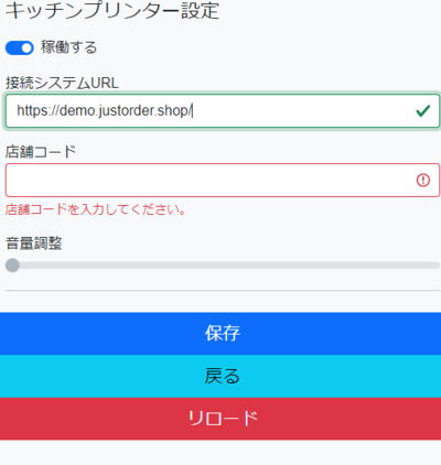 また、接続はできているが印刷ができない場合、JustOrder内の「店舗設定」→「プリンタ設定」もしくは「キッチン設定」を確認してください。