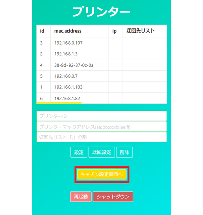 ②登録した「プリンター名」を確認し、「設定」→「キッチン」をタップしてください。