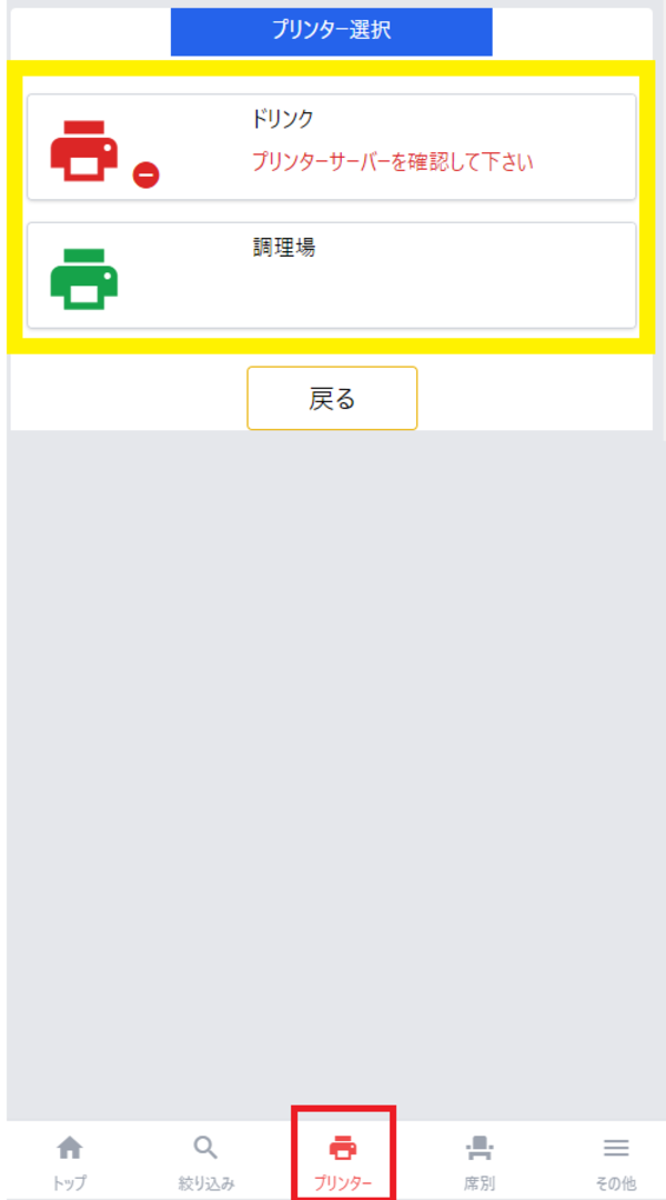 赤色の場合やそもそもプリンターが表示されていない場合、「 キッチン設定画面 」をタップし、手順に沿って進めてください。