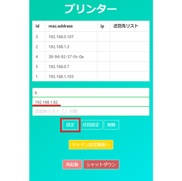 ⑤リストの該当プリンターのアドレスが変更された(=新しいプリンターが登録された)ことを確認し、「キッチン設定画面へ」をタップしてください。