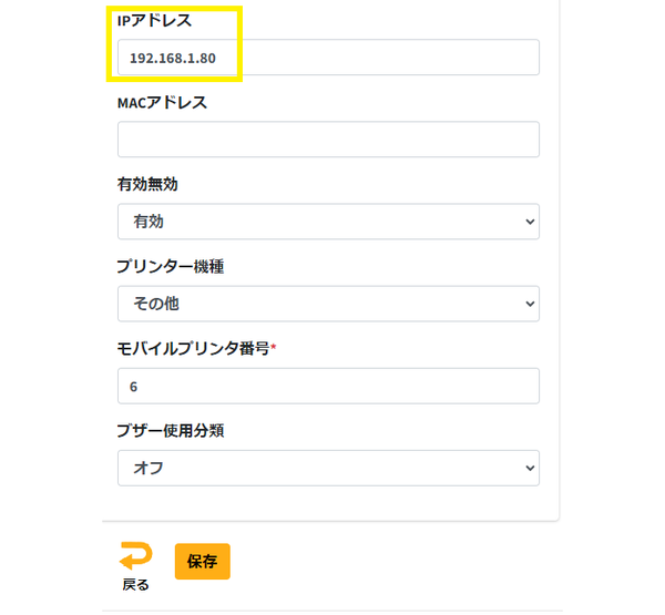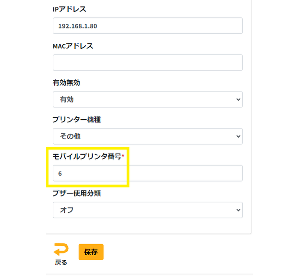 ⑨「キッチンプリンター設定」に戻り入力し、「保存」をタップしてください。