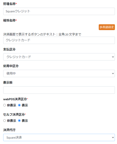 WEBPOS決済区分:WEBPOS上でこの支払方法を表示させるかさせないか設定します。