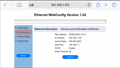 ②プリンターの設定画面が開いたら、画面左の「Configuration」をクリックします。
